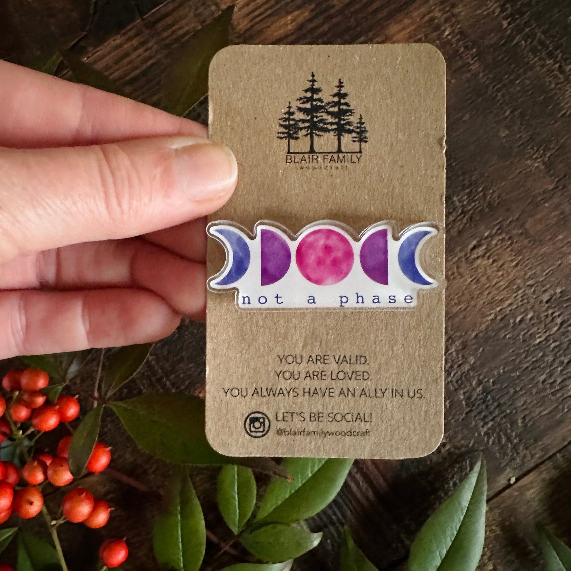 1 1/2" ACeltic Pin featuring our original Not a Phase drawing in bisexual pride colors. Attaches securely to your bag or jacket with a metal clasp on the back.