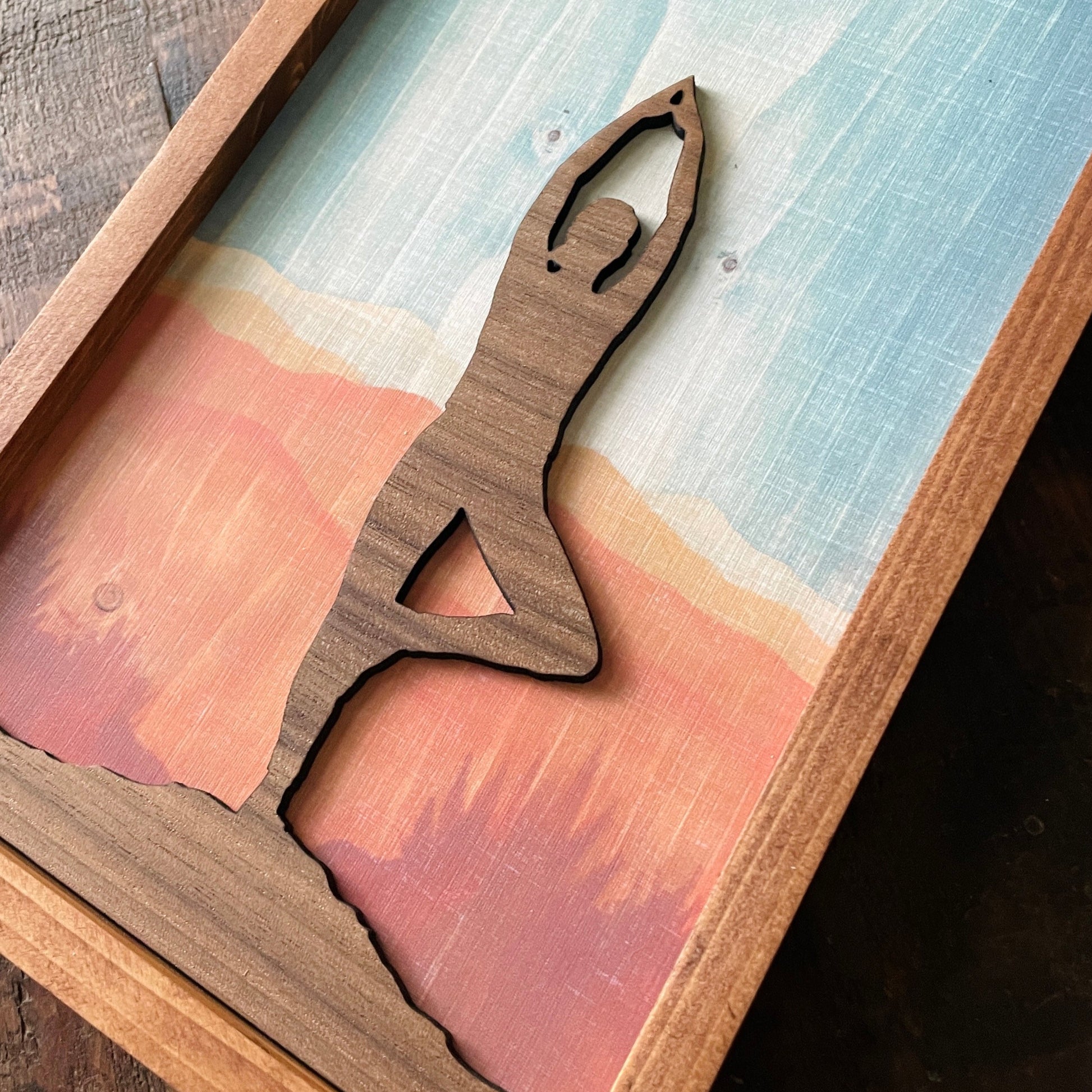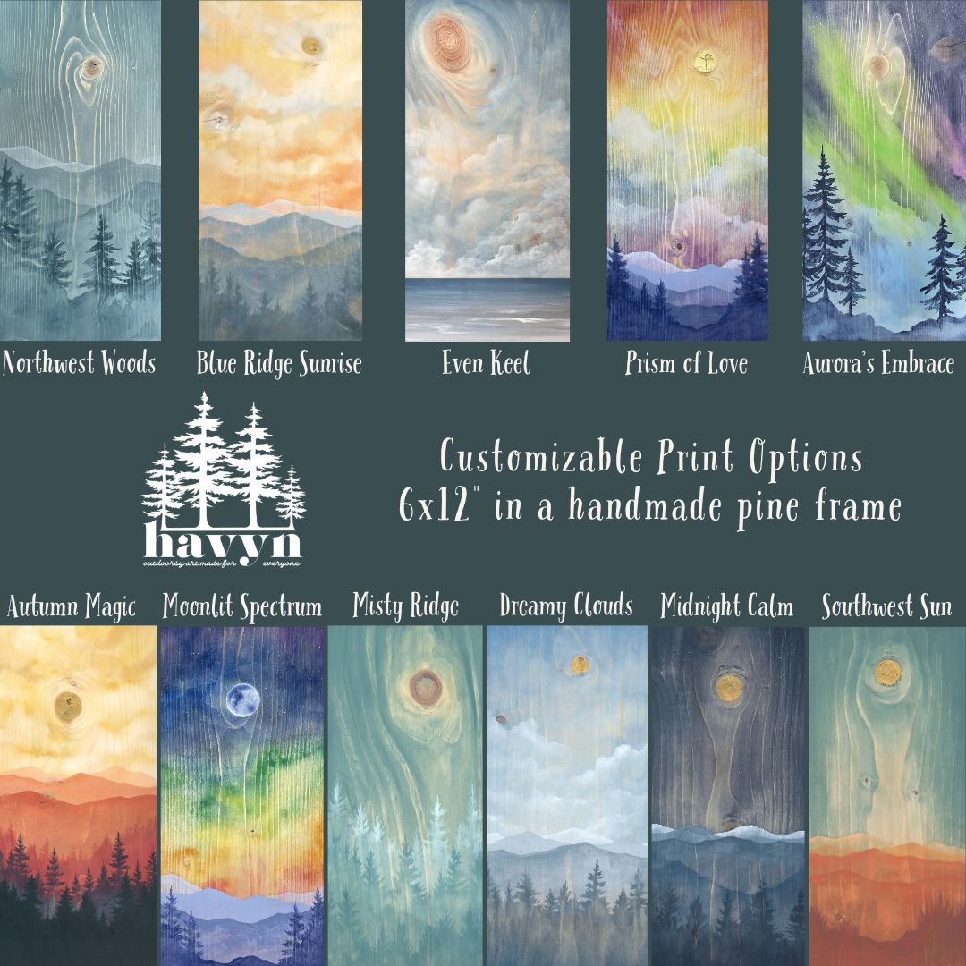 A hyper-realistic linen paper print of our original “Southwest Sun” painting on wood, mounted on a sturdy composite wood backer using archival techniques then finished with a handmade honey-stained pine frame.