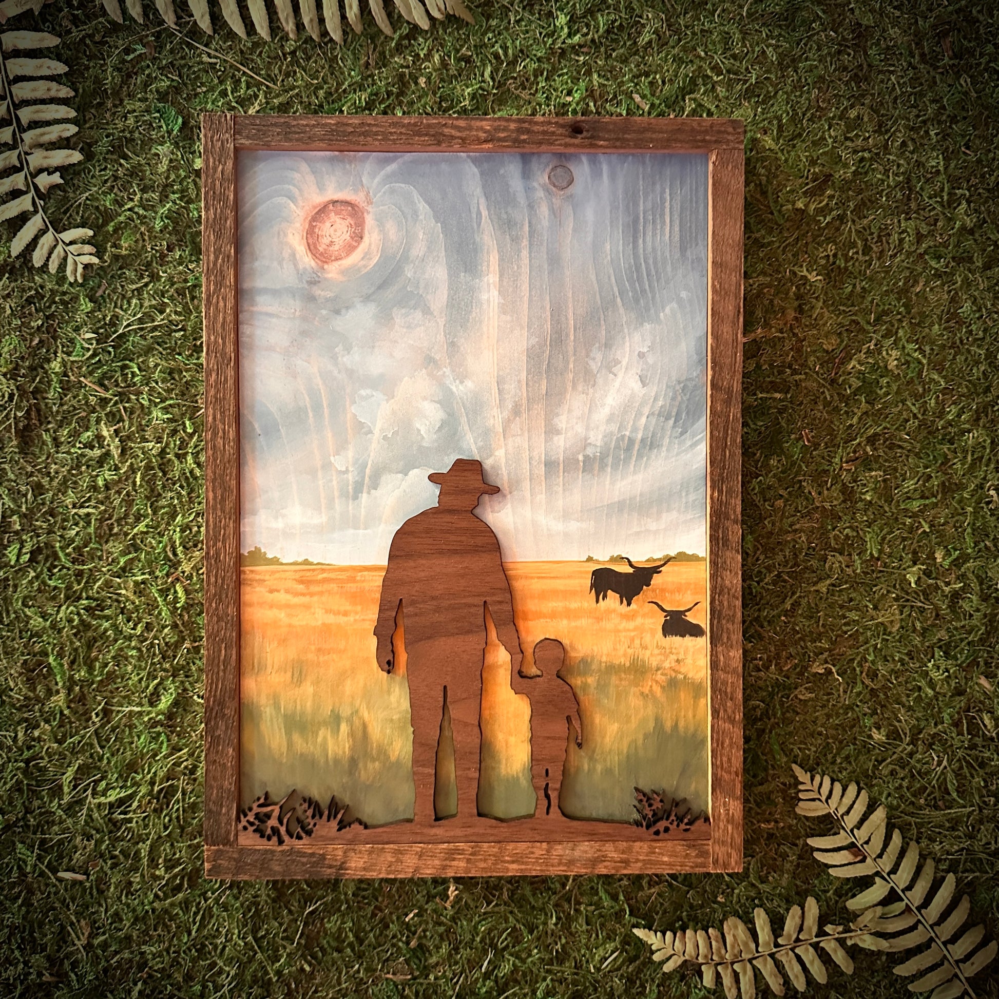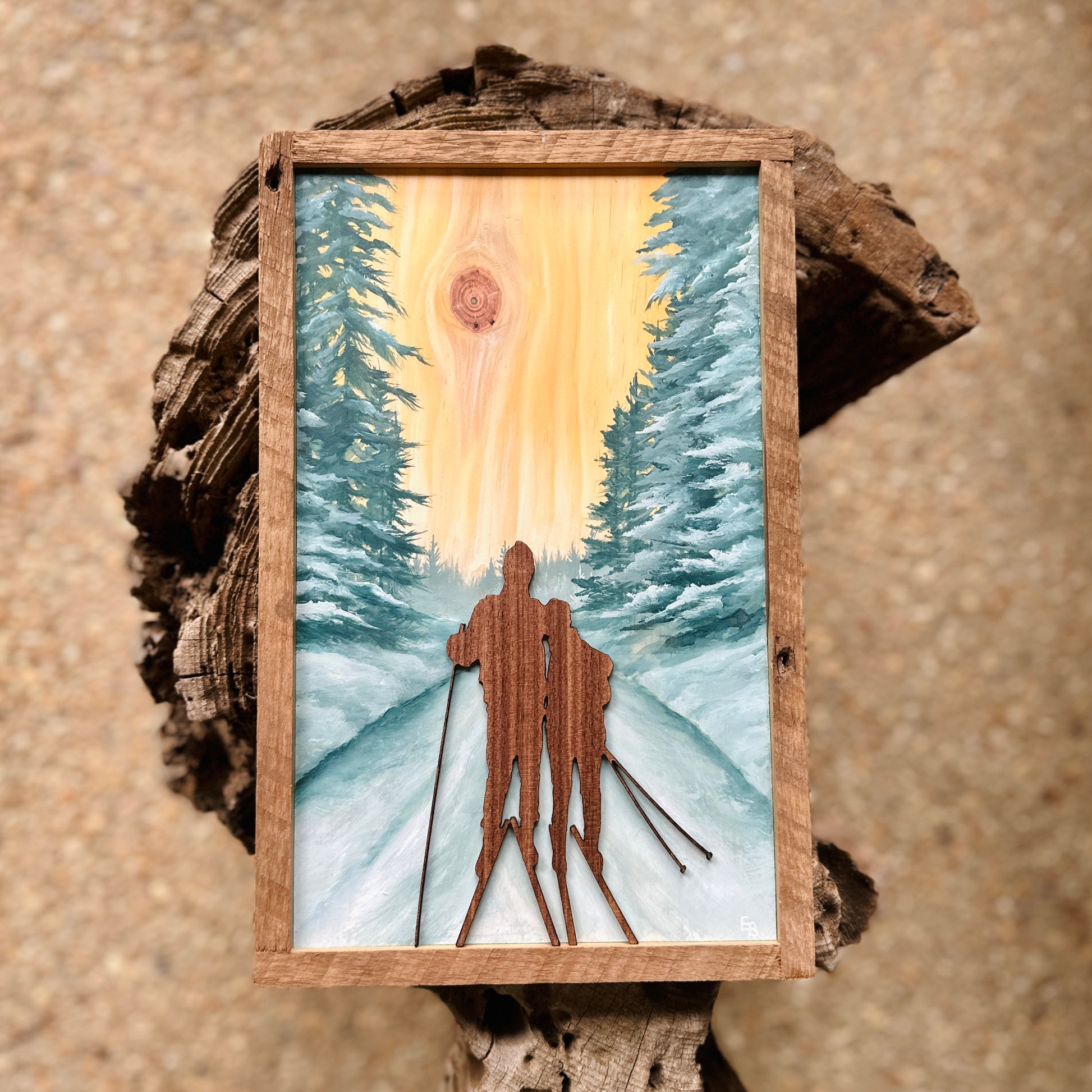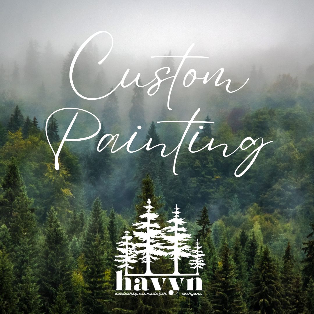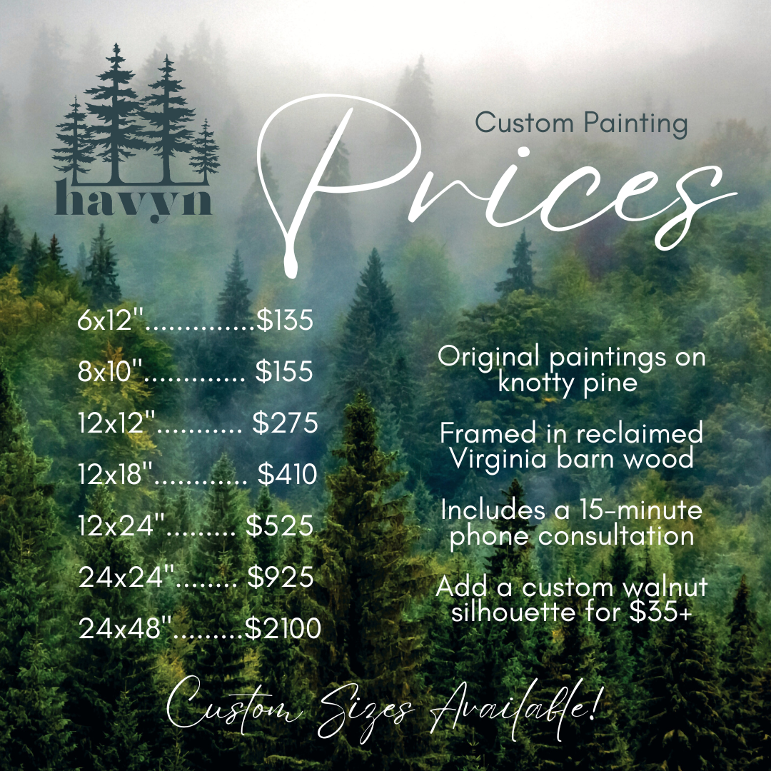 A one-of-a-kind acrylic painting on knotty pine, featuring the scene & color scheme of your choice. Framed in reclaimed, Virginia barn wood and accented with an optional custom walnut silhouette drawn from your personal photo.