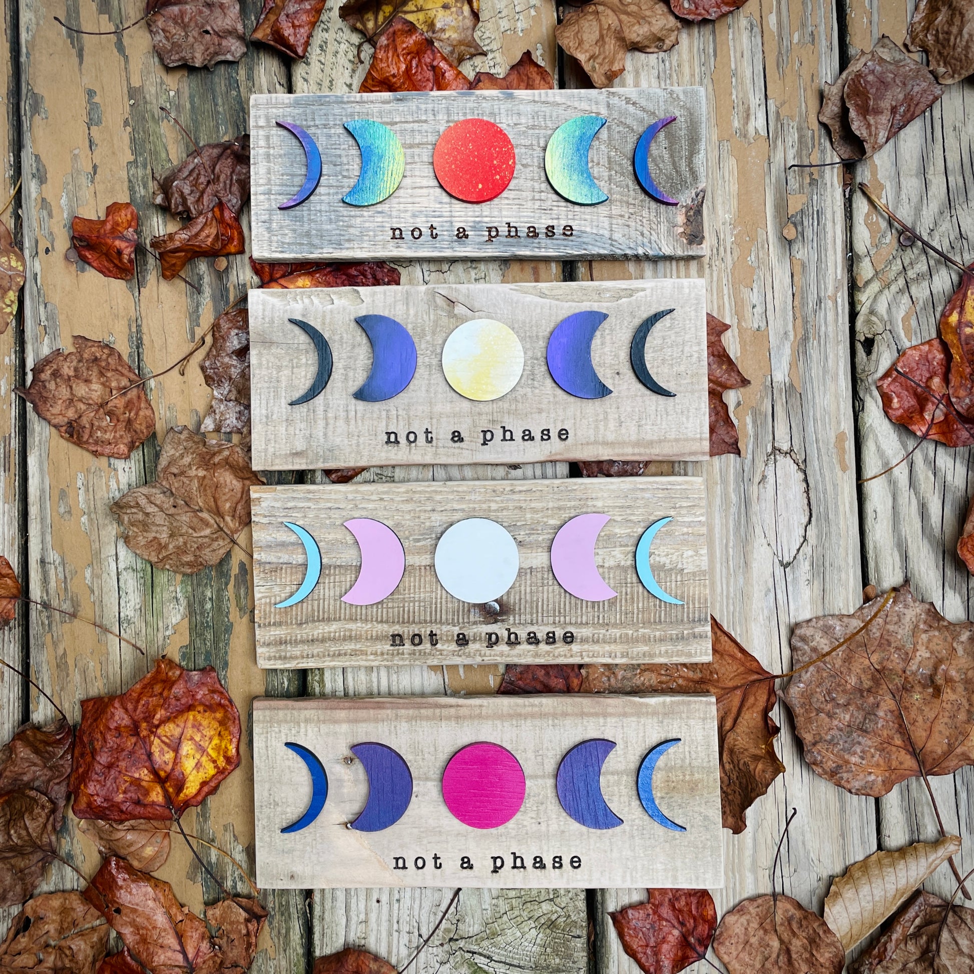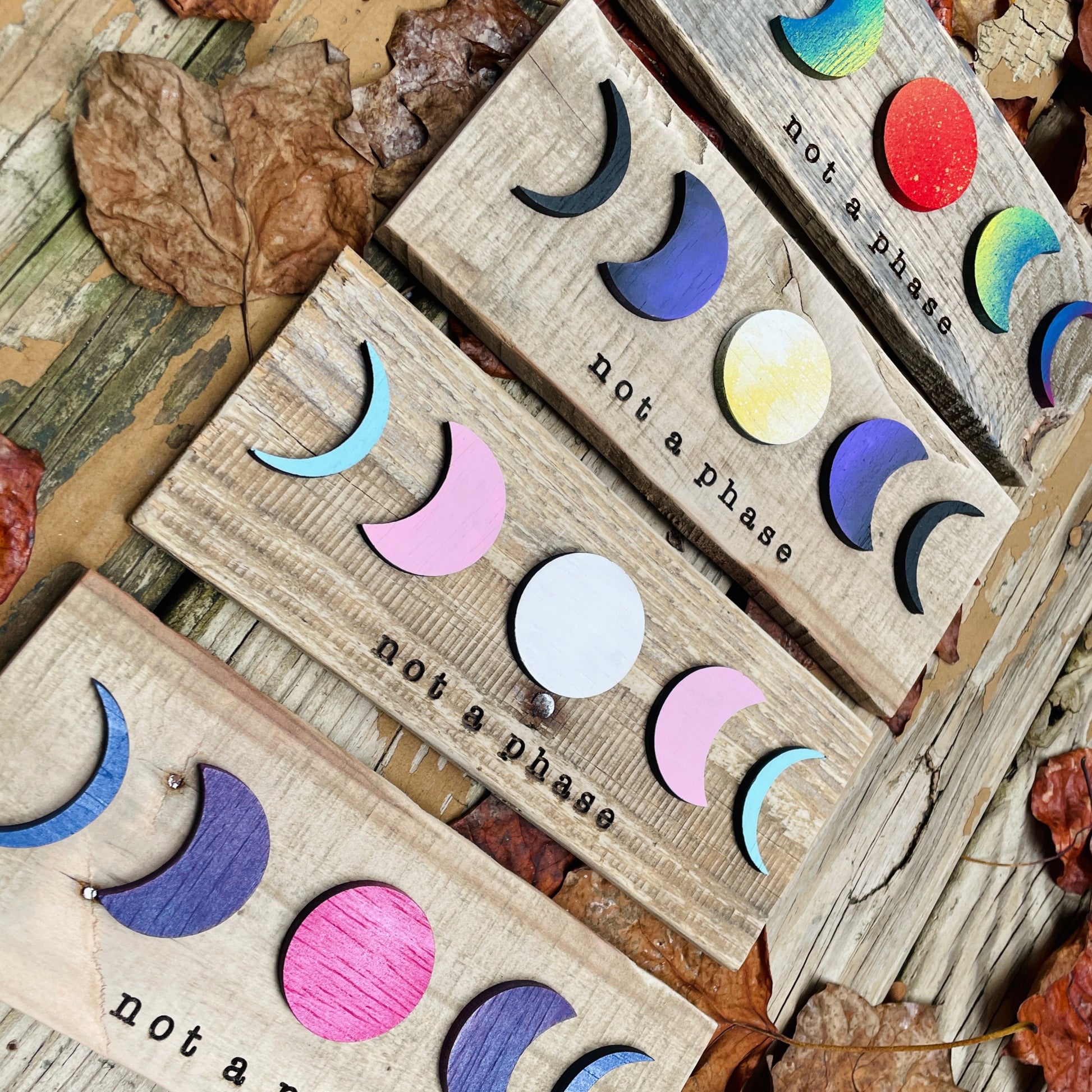 A mini version of our Affirming "Not a Phase" Moon Phase Wall Art in LGBTQ+ pride flag colors. A subtle reminder to us and those we love that our identities are not just a phase.