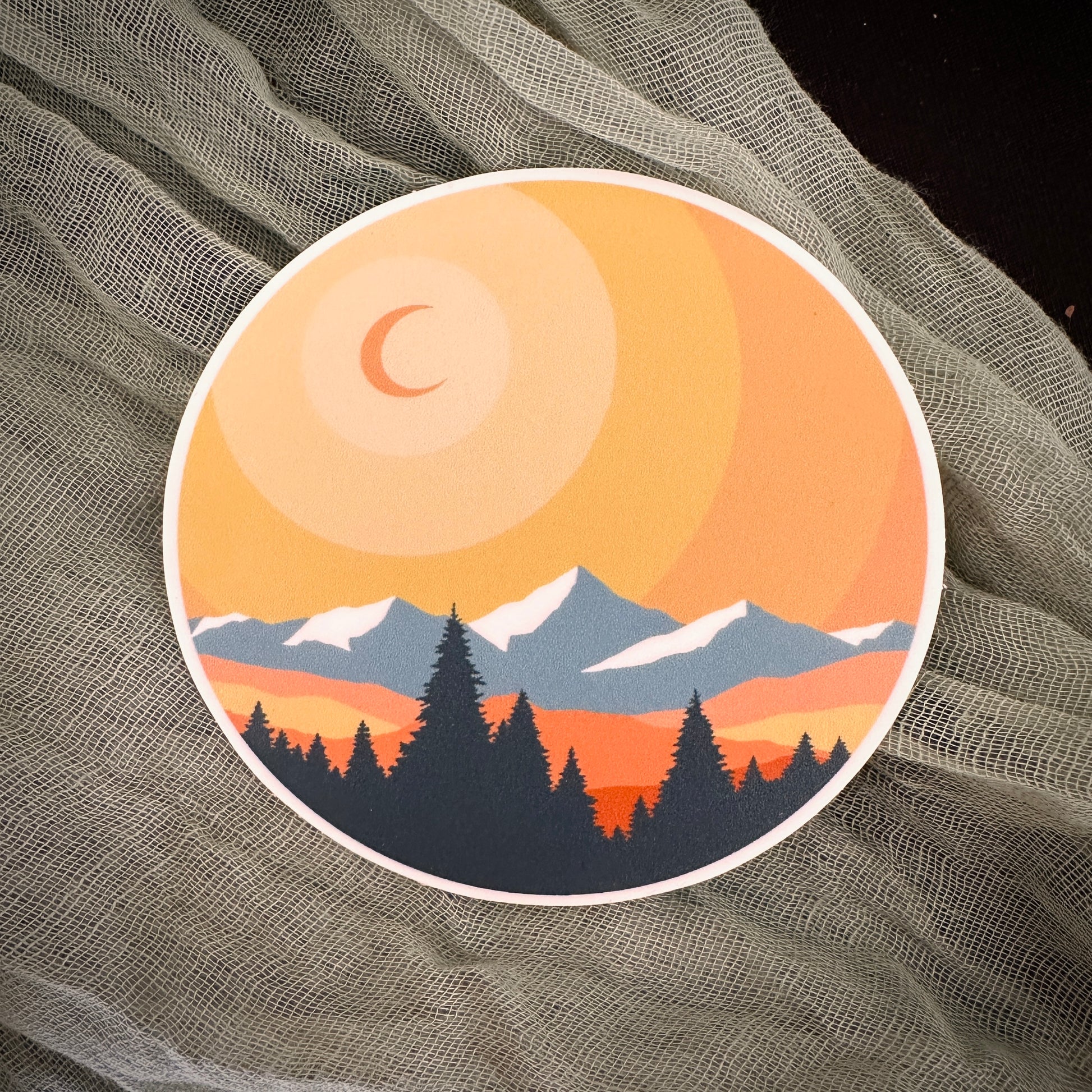 3" weatherproof vinyl sticker with our original "Rocky Mountain Moonrise" design on wood.