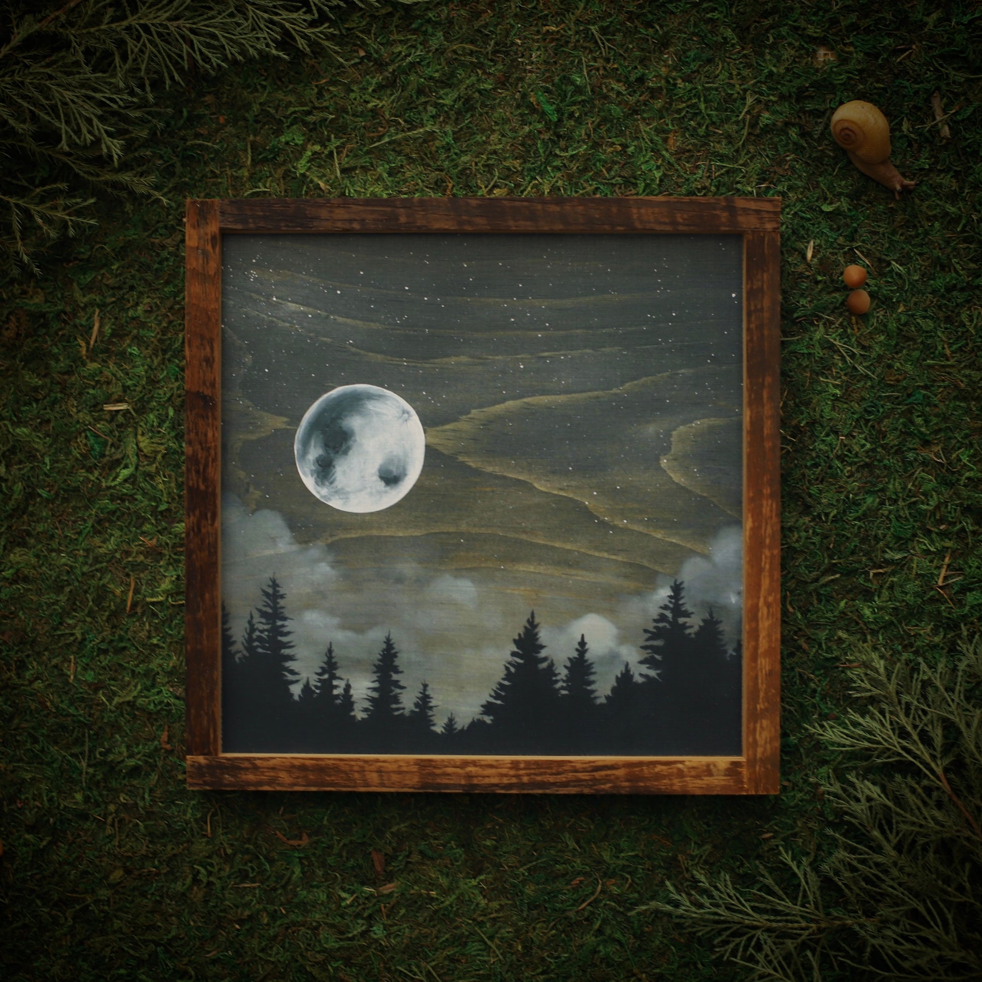 A hyper-realistic fine art print of our original "Wolf Moon" painting on pine. Named for the full moon in January, this print comes in two square sizes.